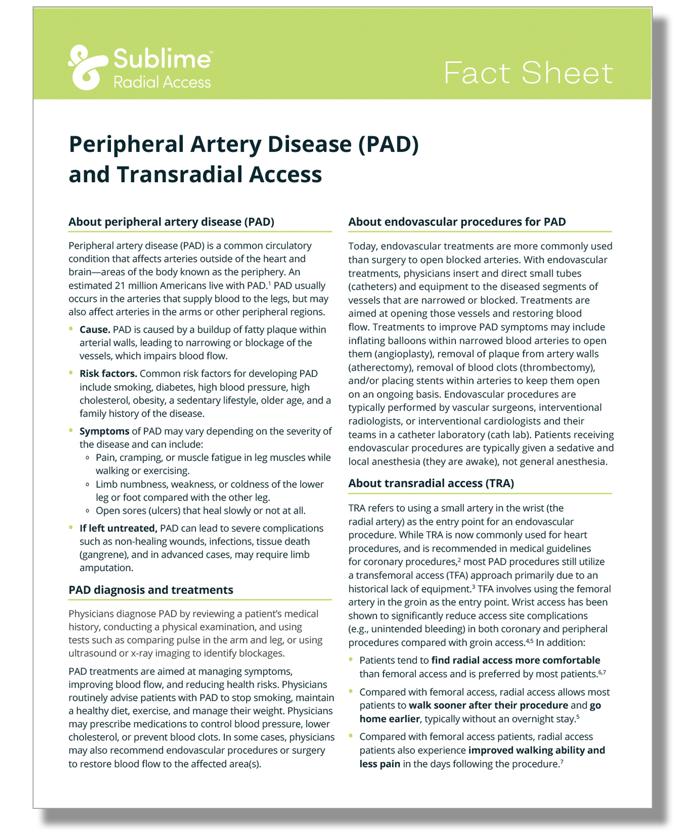 Radial artery access offers many benefits to patients over femoral access, including shorter recovery,1,2 reduced risk of complications,1,3 and an overall more positive experience.1,4 Now radial access is available for peripheral artery disease (PAD) procedures.